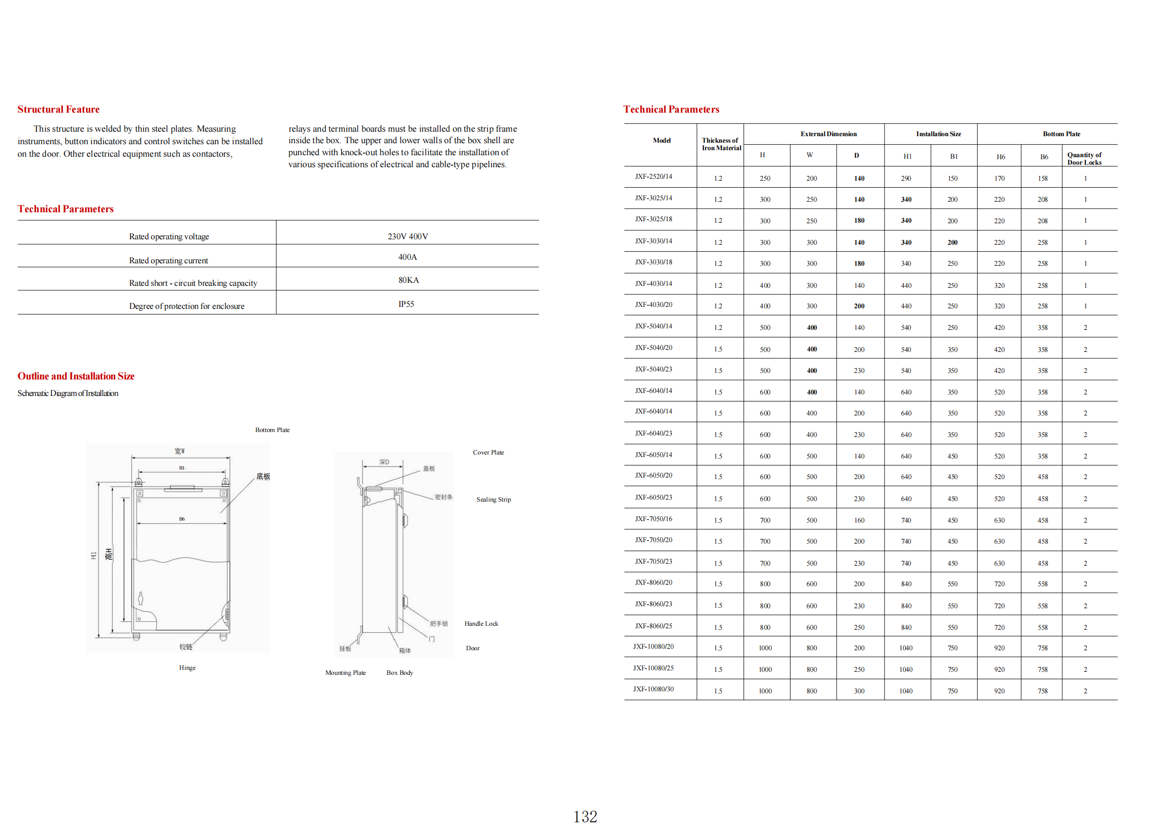 ThisproductisapplicabletocircuitswithanACfrequencyof50Hzandarated workingvoltageof500Vandbelow.Underspecialrequirements,theprotection levelcanreachIP54.Thereareknock-outholes.Formulti-tubeincominglines,a removableopeningplatecanbereserved.Themaximumratedcurrentcanreach 400A.Itisespeciallysuitableformeteringboxesforindustrialandmininghotels.TheprotectionleveloftheproductcasingisIP53.