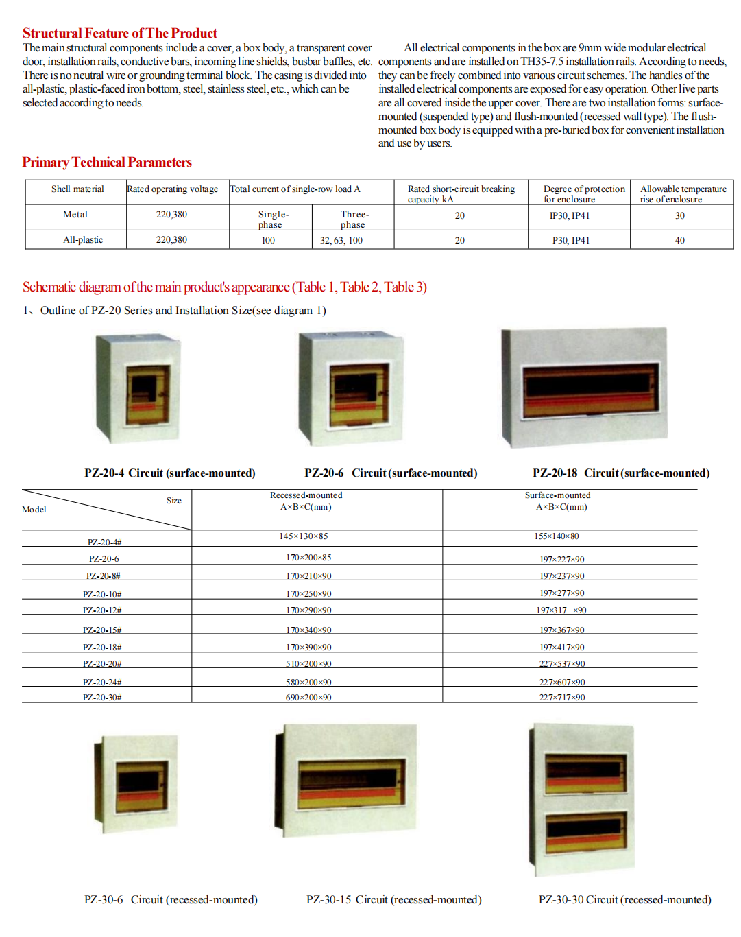 This product isapplicable to the terminal circuitofsingle-phase three-wire or three-phase five-wire with anAC fiequency of 50Hz,a rated working voltageof220Vor380V,and a rated current notexceeding225A.It is used to control and distributepowerto electrical equipment andmeasureelectricity.It provides protection foroverload,shortcircuit,leakage,andundervoltage ofthe line It can beequipped withvariousmolded casecircuit breakers,miniature circuit breakers,miniaturedisconnectors,miniature leakage protectors,modular contactors,buttons,indicatorlights,and special modulartimer switches,surge protectors,etc Itcanbe widelyusedinmodem hotels,commercial and industialenterprises,andresidentialbuildings. The product complies withIEC6039.3-2001M"Low-voltage switchgear andcontrolgear assemblies"and GB7251.3-2006 "Low-voltage switchgear andcontrolgear assemblies"