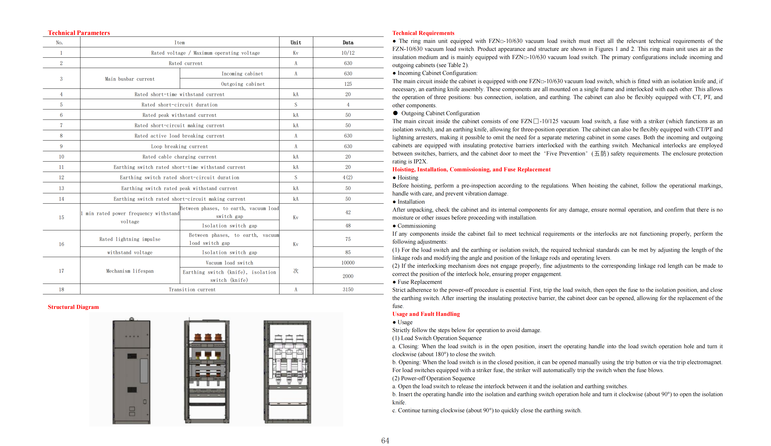 The HXGN-12ZF(R)box-type fixed metal-enclosed switchgear (referred to as ringmain unit)is suitable for 10kV AC networks with a frequency of 50Hz,used forbreaking load current,short-circuit current,and making short-circuit current.This ringmain unit is equipped with manual and electric spring mechanisms to operate the loadswitch,earthing switch,and isolation switch,which are manually operated.The unit hasstrong completeness,a compact size,and no risk of fire or explosion,and it featuresreliable "five-proof"functions.